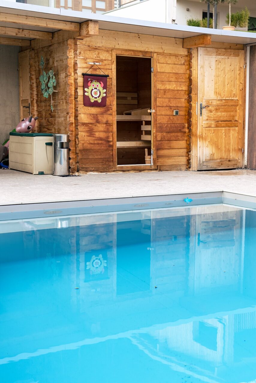 INFINITY POOL mit Liegen Chill Out Bereich sowie Sport & Spielfläche und Sauna
